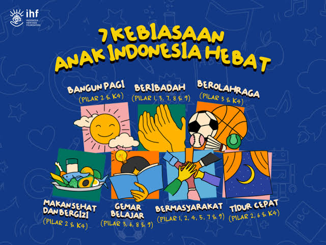 7 Kebiasaan Anak Indonesia Hebat yang harus dilaksanakan adalah Bangun Pagi, Beribadah, Berolahraga, Makan Sehat dan Bergizi, Gemar Belajar, Bermasyarakat, dan Tidur Cepat.
